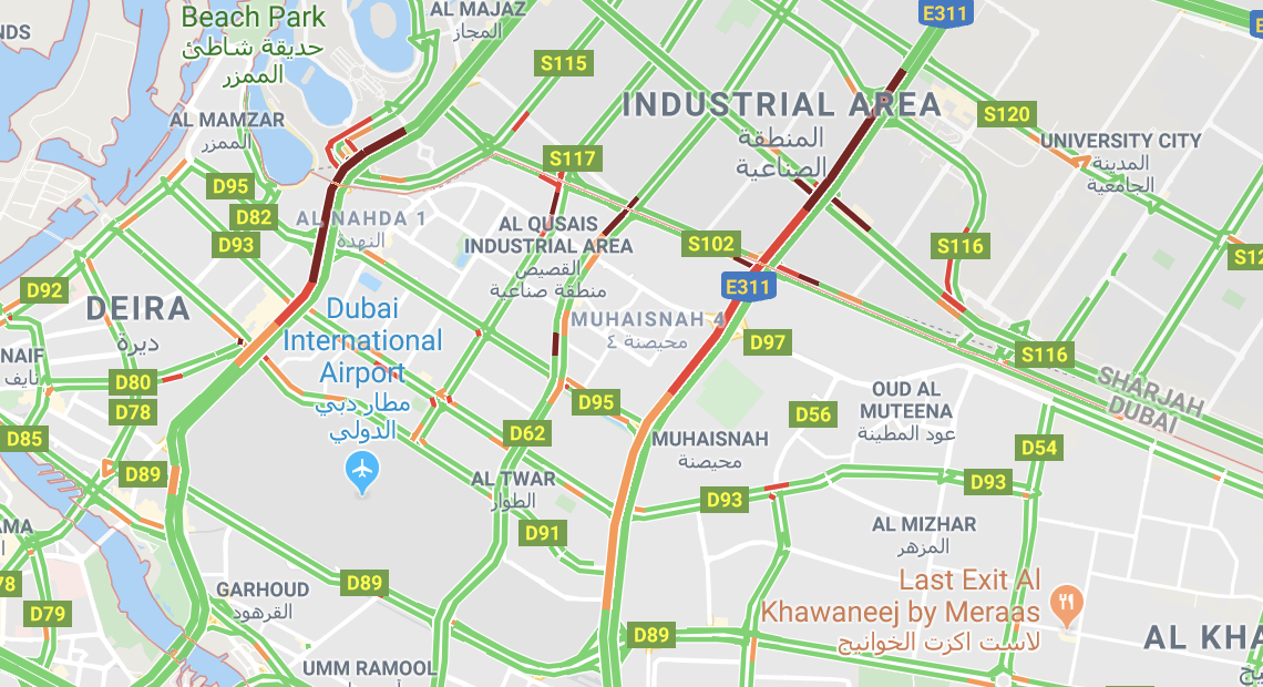 According to Google Maps, traffic was observed on E11, E311 and a part of Sheikh Zayed road due to an accident.