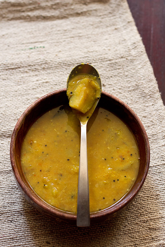 10. Serve the brinjal sambar hot with steamed rice.