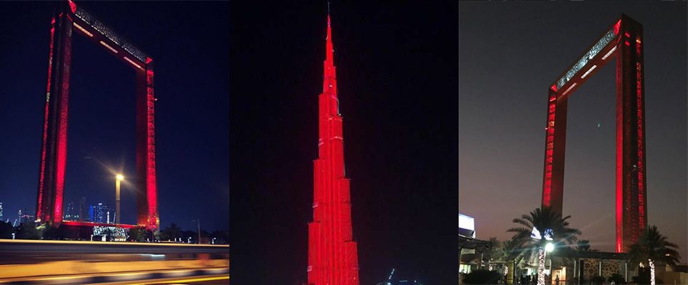 And the Abu Dhabi Frame isn’t the only landmark that is expected to be lit up in the brilliant red hue. The world’s tallest building – Burj Khalifa, is also lit up in the same magnificent hue. Onlookers in Downtown Dubai, early Tuesday Morning were all treated to a sneak peak of the Burj Khalifa and the intricate LED lighting system.