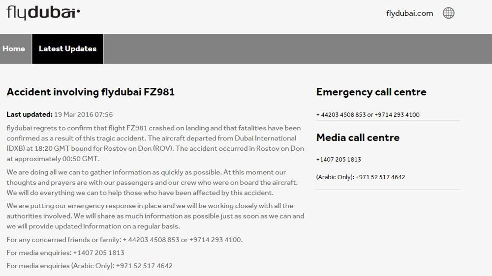 “Everyone at flydubai is in deep shock and our hearts go out to the families and friends of those involved. We don’t yet know all the details of the accident but we are working closely with the authorities to establish the cause. We are making every effort to care for those affected and will provide assistance to the loved ones of those on board.”