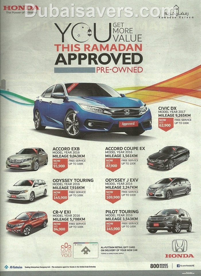 You get more value this Ramadan with Honda Pre-approved cars. Choose from a wide range of Honda Pre-Approved vehicles starting from as low as AED 62,900 and free service up to 100,000 km. View related image for more details.