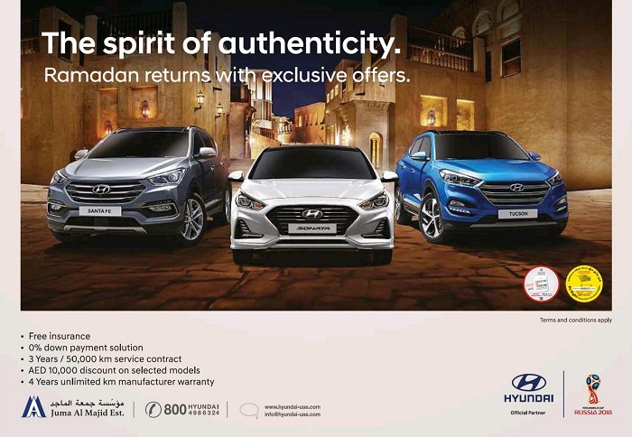 Buy New Hyundai During this Ramadan and get Exclusive offers including Free Insurance, Down Payment, 3years/50,000 KMs Service Contract, AED 10,000 on Selected Models, 4 Years Unlimited KM Manufacturers Warranty For This Ramadan 2018(UAE)