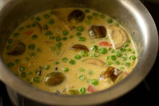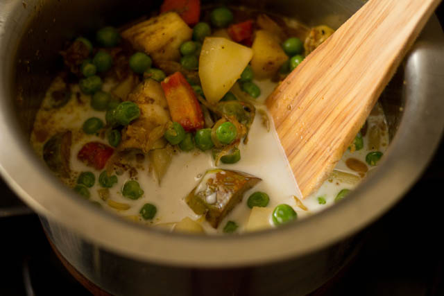 - Add the coconut milk. stir and then add water along with lemon juice.