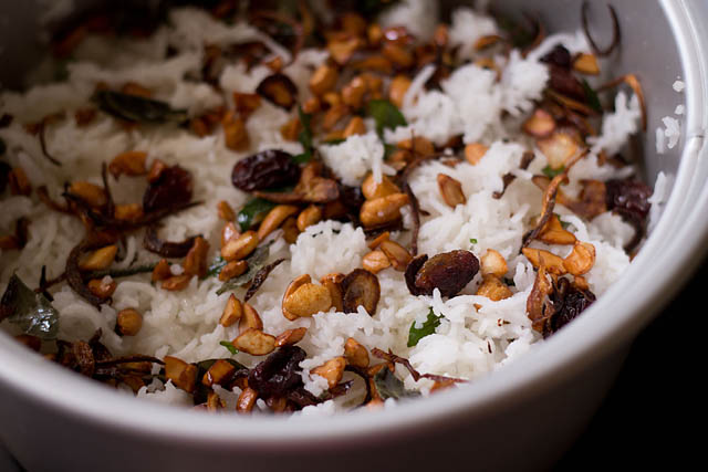 - Remove and add the fried onions, cashews, raisins and curry leaves to the cooked rice.
