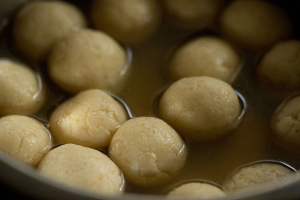 - Meanwhile take each rasgulla and with a spatula apply pressure, so the excess sugar syrup is removed from it. You can also press the rasgulla in your palms. be gentle and don’t apply too much of pressure. as then the rasgullas will break. do this with all the rasgullas.