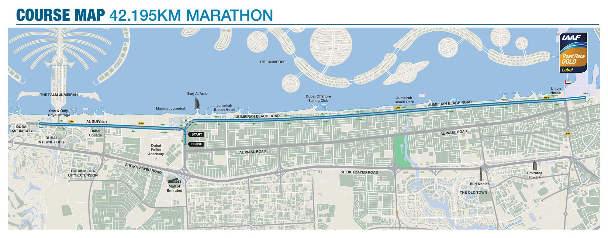 The 42km-long marathon route starts from Umm Suqeim Street, between the two intersections of Dubai Police Academy and Madinat Jumeirah, passing through King Salman Bin Abdul Aziz Street, Jumeirah Street and returns to Umm Suqeim Street.