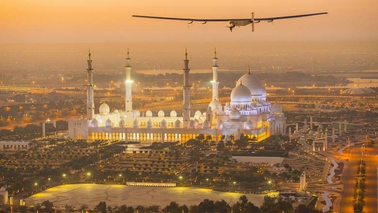 Solar Impulse 2 flies over the Shaikh Zayed Grand Mosque in Abu Dhabi during its preparation last year.