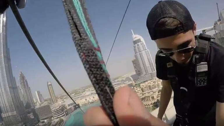After taking an elevator to the top of an apartment building on Emaar Boulevard and then walking up a few flights of stairs to the roof – 90 metres off the ground, participants are then strapped into safety harnesses. Details
